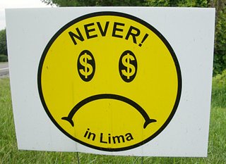 From what I've heard, Eric Massa's position on Wal-Mart reflects this concern. In his July 20 appearance on the Bob Lonsberry show, Massa noted that he doesn't shop at Wal-Mart and instead prefers locally-owned businesses. I don't remember a lot of doctrinare rhetoric about the evils of Wal-Mart, just a practical concern over the area's economy. Judging from the signs, this position will go down well in the part of the 29th that borders Lima.